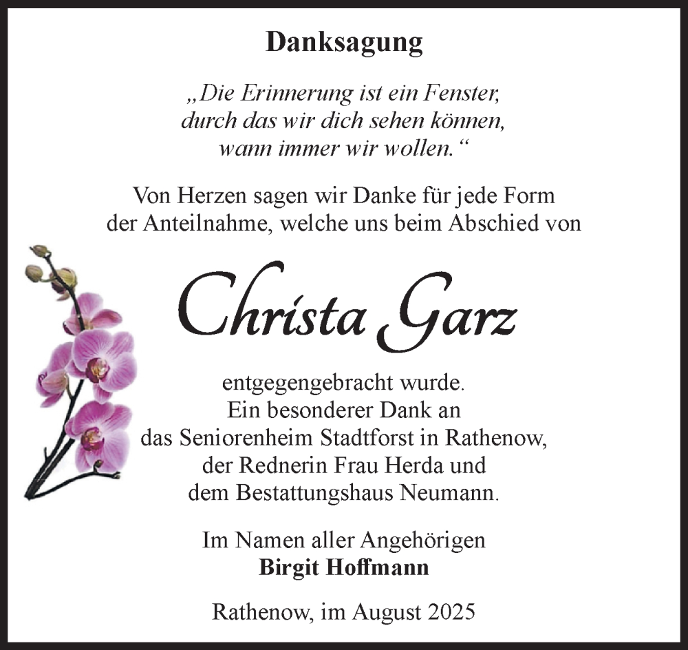 Hier finden Sie alle Traueranzeigen aus der Zeitung, die bisher für Christa Garz erschienen sind. Weitere Traueranzeigen, die in der Zeitung erscheinen, werden hier ebenfalls aufgelistet
