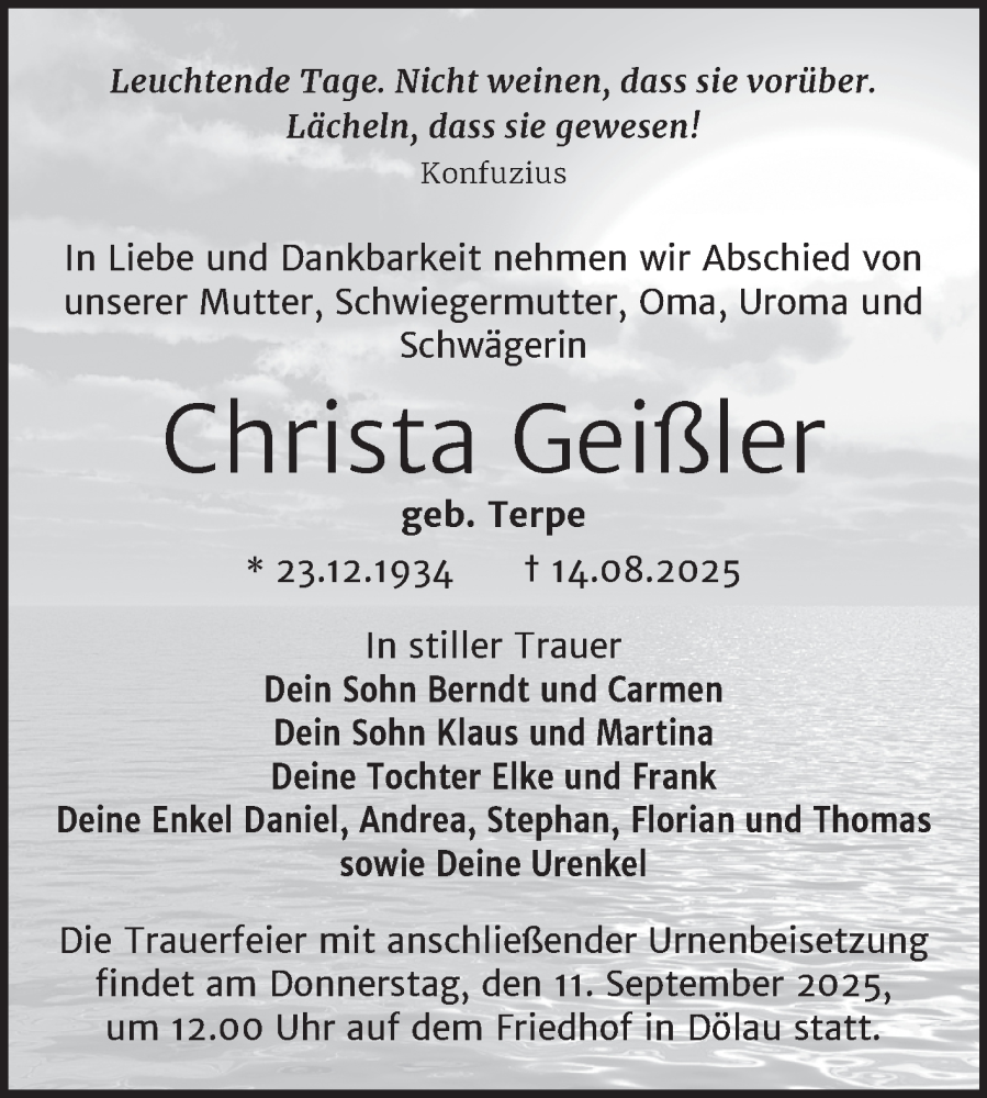 Hier finden Sie alle Traueranzeigen aus der Zeitung, die bisher für Christa Geißler erschienen sind. Weitere Traueranzeigen, die in der Zeitung erscheinen, werden hier ebenfalls aufgelistet