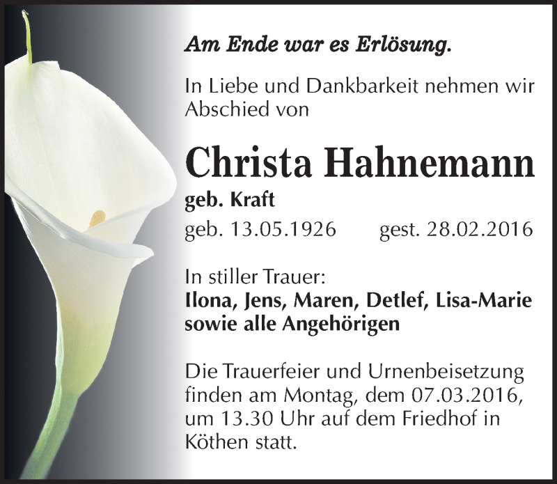 Hier finden Sie alle Traueranzeigen aus der Zeitung, die bisher für Christa Hahnemann erschienen sind. Weitere Traueranzeigen, die in der Zeitung erscheinen, werden hier ebenfalls aufgelistet