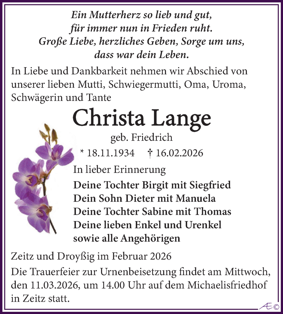 Hier finden Sie alle Traueranzeigen aus der Zeitung, die bisher für Christa Lange erschienen sind. Weitere Traueranzeigen, die in der Zeitung erscheinen, werden hier ebenfalls aufgelistet