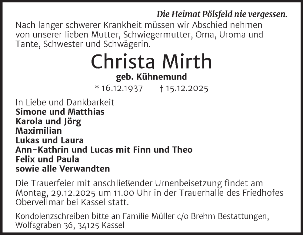 Hier finden Sie alle Traueranzeigen aus der Zeitung, die bisher für Christa Mirth erschienen sind. Weitere Traueranzeigen, die in der Zeitung erscheinen, werden hier ebenfalls aufgelistet