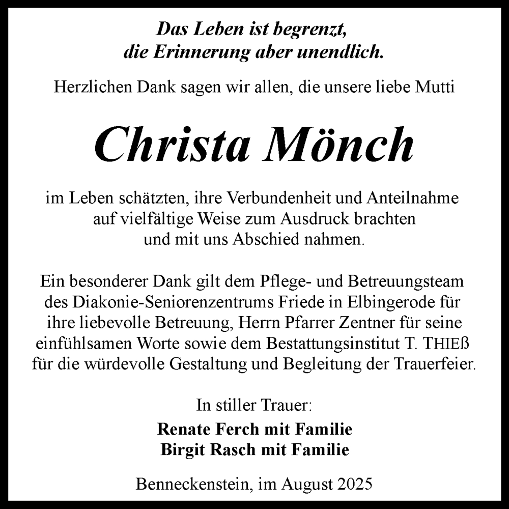 Hier finden Sie alle Traueranzeigen aus der Zeitung, die bisher für Christa Mönch erschienen sind. Weitere Traueranzeigen, die in der Zeitung erscheinen, werden hier ebenfalls aufgelistet