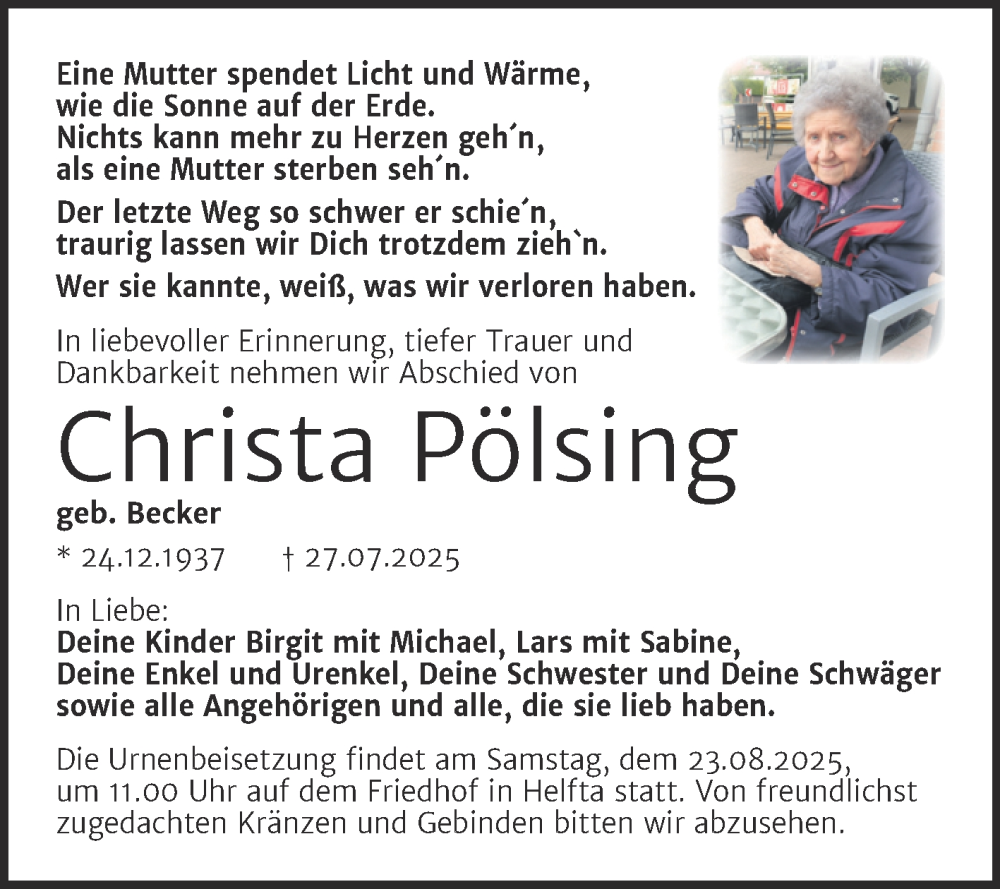Hier finden Sie alle Traueranzeigen aus der Zeitung, die bisher für Christa Pölsing erschienen sind. Weitere Traueranzeigen, die in der Zeitung erscheinen, werden hier ebenfalls aufgelistet