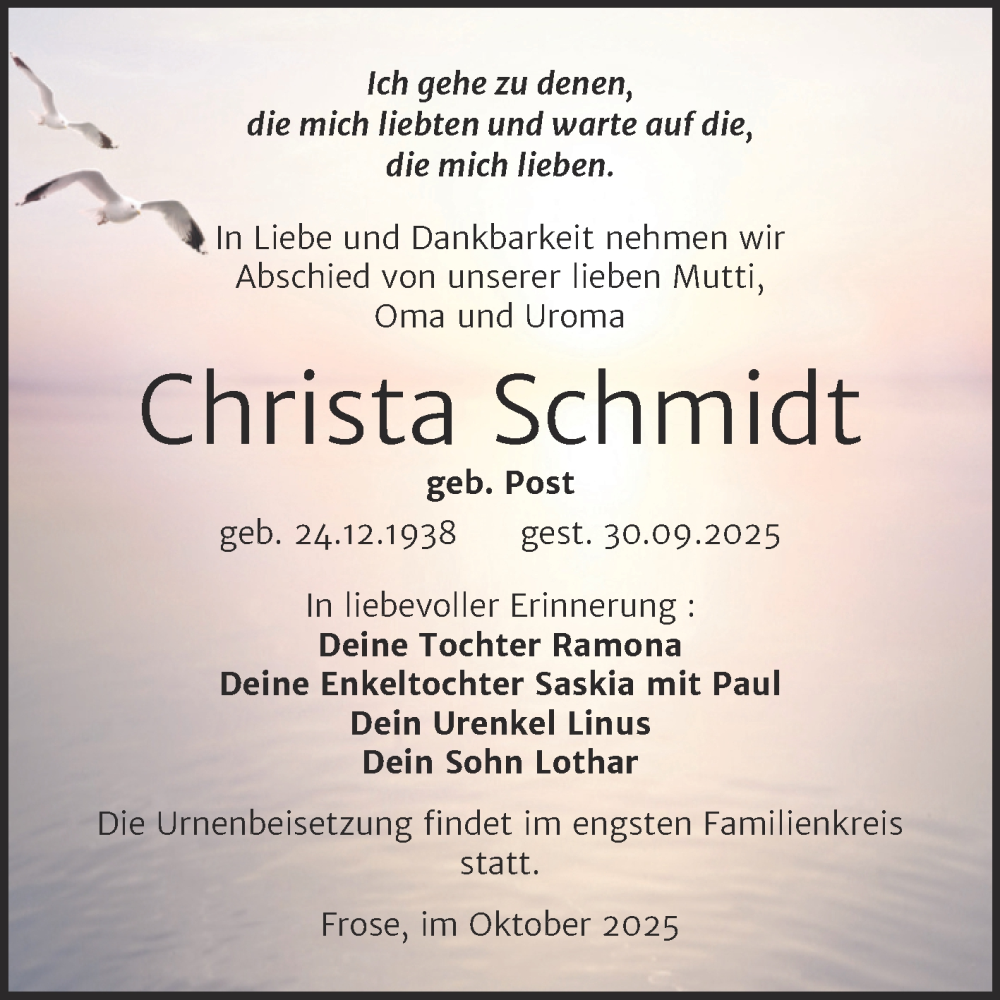 Hier finden Sie alle Traueranzeigen aus der Zeitung, die bisher für Christa Schmidt erschienen sind. Weitere Traueranzeigen, die in der Zeitung erscheinen, werden hier ebenfalls aufgelistet