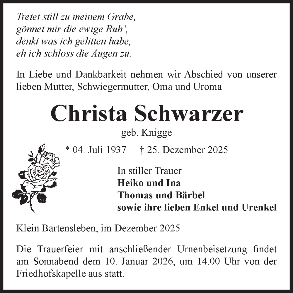 Hier finden Sie alle Traueranzeigen aus der Zeitung, die bisher für Christa Schwarzer erschienen sind. Weitere Traueranzeigen, die in der Zeitung erscheinen, werden hier ebenfalls aufgelistet