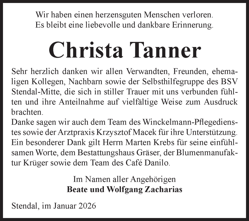 Hier finden Sie alle Traueranzeigen aus der Zeitung, die bisher für Christa Tanner erschienen sind. Weitere Traueranzeigen, die in der Zeitung erscheinen, werden hier ebenfalls aufgelistet