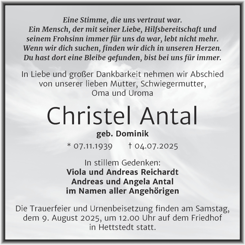 Hier finden Sie alle Traueranzeigen aus der Zeitung, die bisher für Christel Antal erschienen sind. Weitere Traueranzeigen, die in der Zeitung erscheinen, werden hier ebenfalls aufgelistet