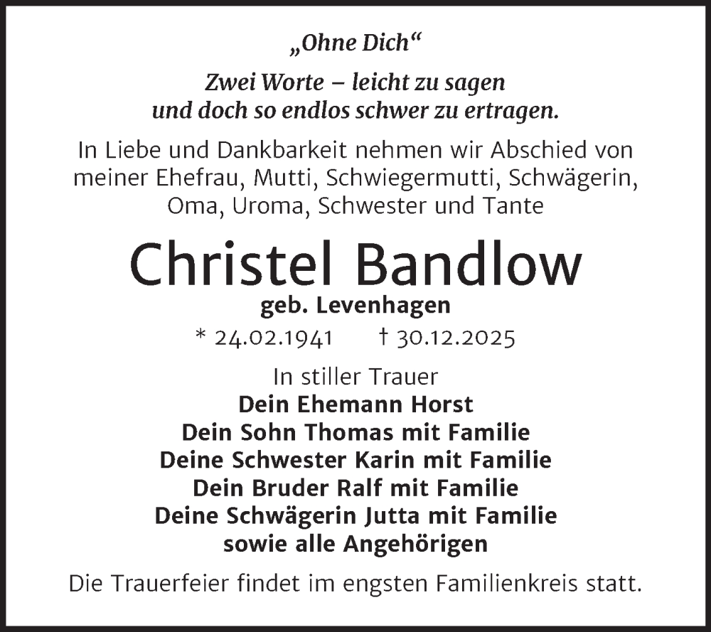 Hier finden Sie alle Traueranzeigen aus der Zeitung, die bisher für Christel Bandlow erschienen sind. Weitere Traueranzeigen, die in der Zeitung erscheinen, werden hier ebenfalls aufgelistet