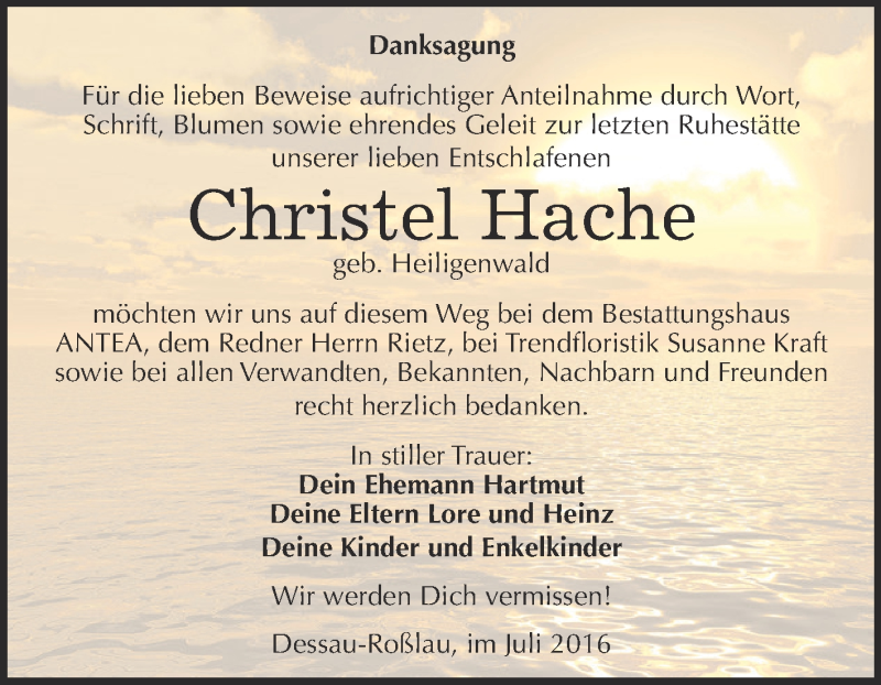 Hier finden Sie alle Traueranzeigen aus der Zeitung, die bisher für Christel Hache erschienen sind. Weitere Traueranzeigen, die in der Zeitung erscheinen, werden hier ebenfalls aufgelistet