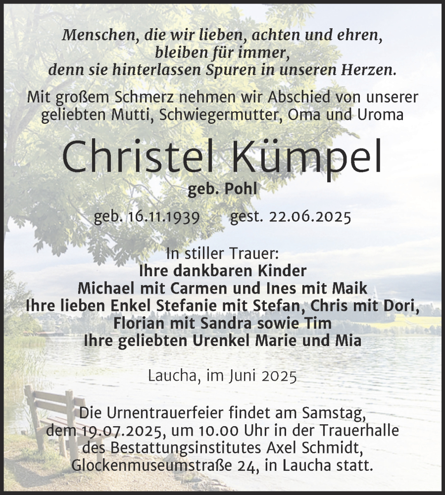 Hier finden Sie alle Traueranzeigen aus der Zeitung, die bisher für Christel Kümpel erschienen sind. Weitere Traueranzeigen, die in der Zeitung erscheinen, werden hier ebenfalls aufgelistet