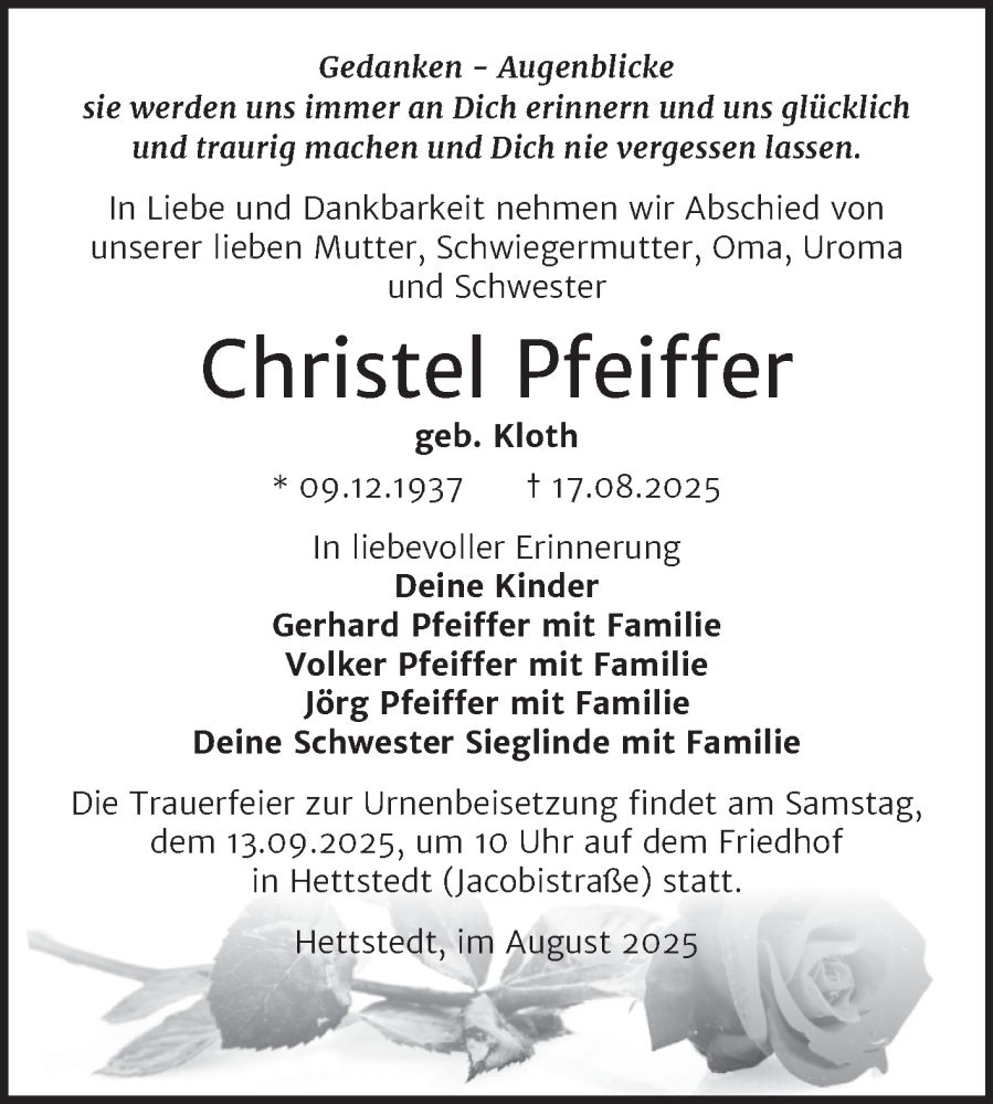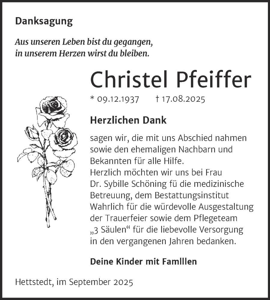 Hier finden Sie alle Traueranzeigen aus der Zeitung, die bisher für Christel Pfeiffer erschienen sind. Weitere Traueranzeigen, die in der Zeitung erscheinen, werden hier ebenfalls aufgelistet