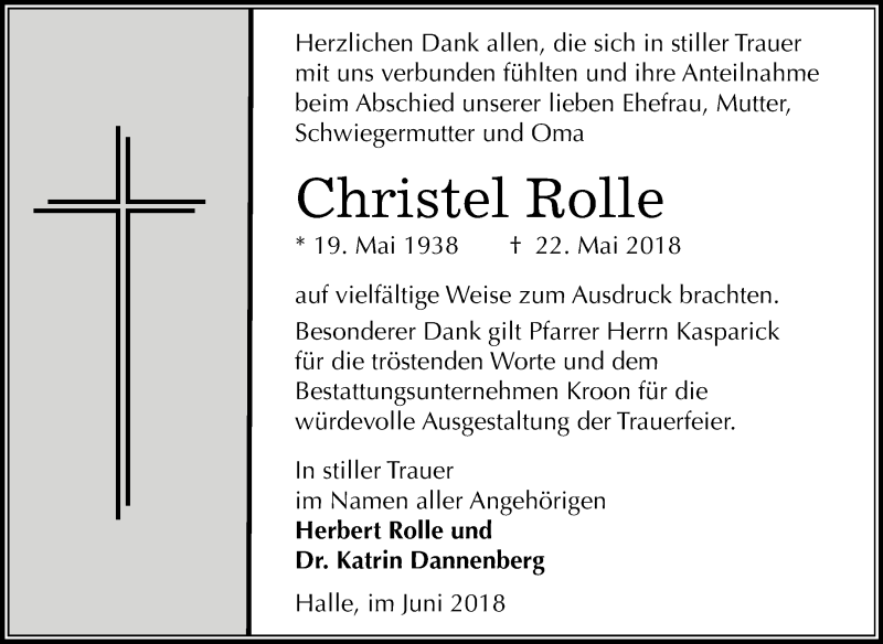 Hier finden Sie alle Traueranzeigen aus der Zeitung, die bisher für Christel Rolle erschienen sind. Weitere Traueranzeigen, die in der Zeitung erscheinen, werden hier ebenfalls aufgelistet