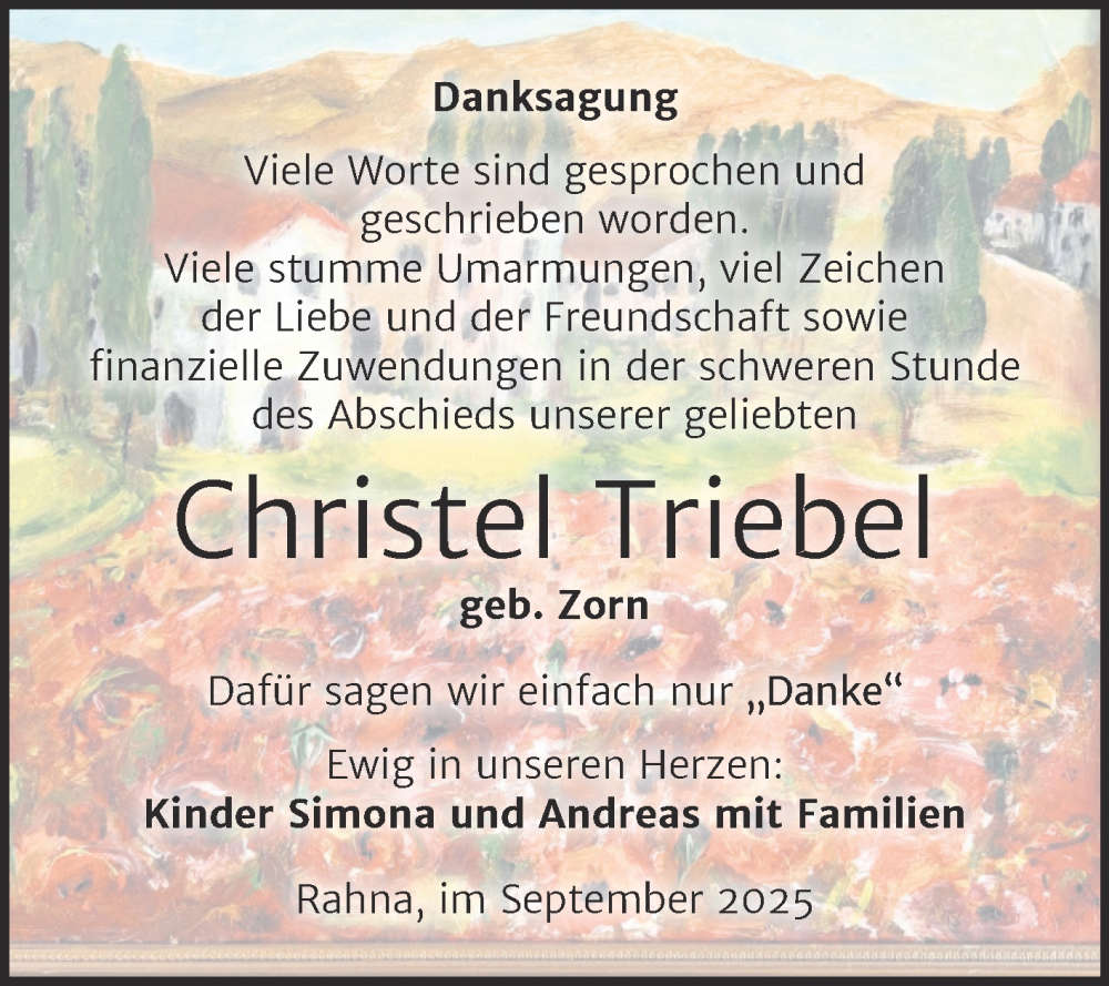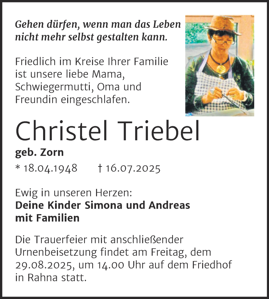 Hier finden Sie alle Traueranzeigen aus der Zeitung, die bisher für Christel Triebel erschienen sind. Weitere Traueranzeigen, die in der Zeitung erscheinen, werden hier ebenfalls aufgelistet