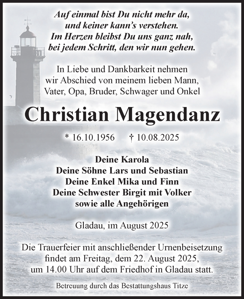 Hier finden Sie alle Traueranzeigen aus der Zeitung, die bisher für Christian Magendanz erschienen sind. Weitere Traueranzeigen, die in der Zeitung erscheinen, werden hier ebenfalls aufgelistet