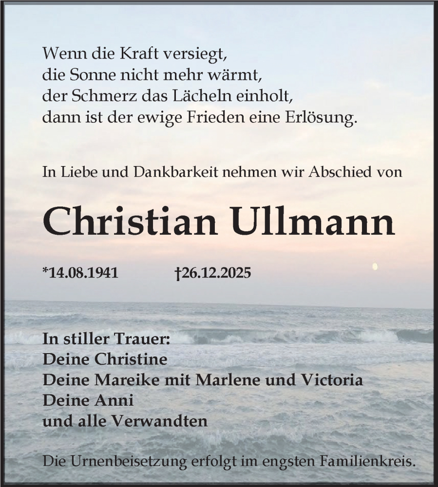 Hier finden Sie alle Traueranzeigen aus der Zeitung, die bisher für Christian Ullmann erschienen sind. Weitere Traueranzeigen, die in der Zeitung erscheinen, werden hier ebenfalls aufgelistet