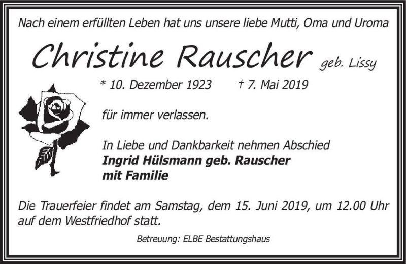 Hier finden Sie alle Traueranzeigen aus der Zeitung, die bisher für Christine Rauscher (geb. Lissy) erschienen sind. Weitere Traueranzeigen, die in der Zeitung erscheinen, werden hier ebenfalls aufgelistet