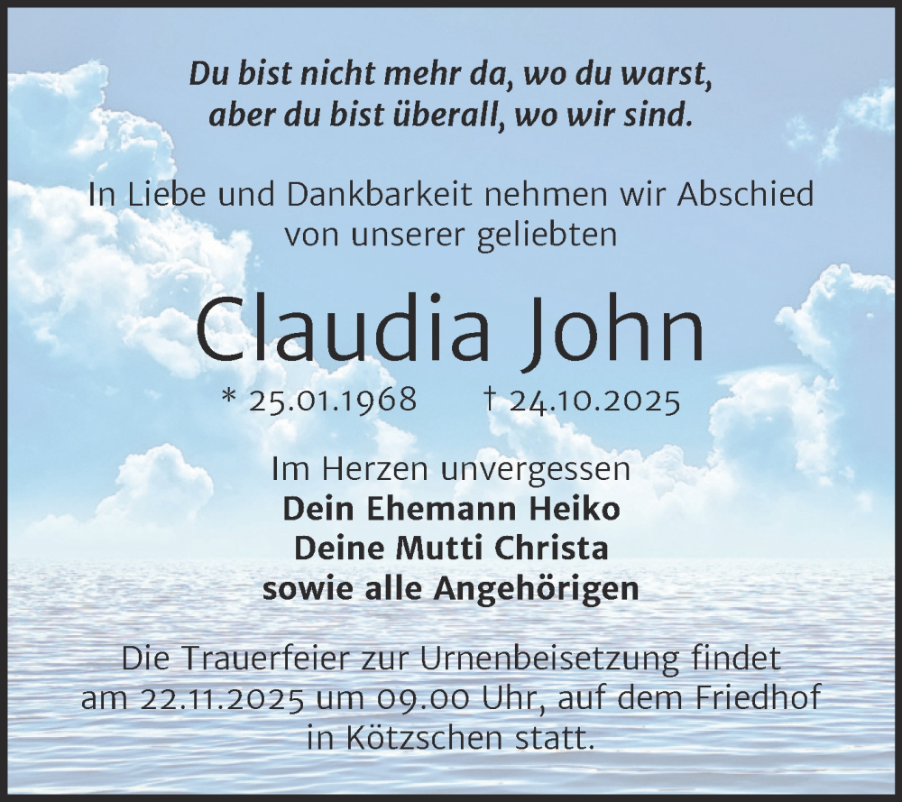 Hier finden Sie alle Traueranzeigen aus der Zeitung, die bisher für Claudia John erschienen sind. Weitere Traueranzeigen, die in der Zeitung erscheinen, werden hier ebenfalls aufgelistet