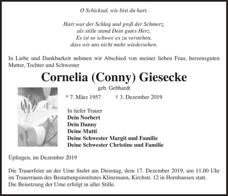 Hier finden Sie alle Traueranzeigen aus der Zeitung, die bisher für Cornelia "Conny" Giesecke (geb. Gebhardt) erschienen sind. Weitere Traueranzeigen, die in der Zeitung erscheinen, werden hier ebenfalls aufgelistet