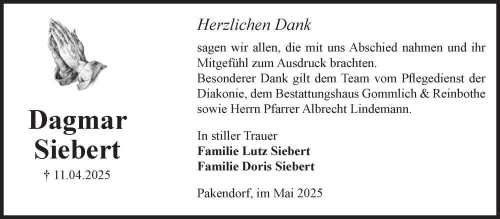 Hier finden Sie alle Traueranzeigen aus der Zeitung, die bisher für Dagmar Siebert erschienen sind. Weitere Traueranzeigen, die in der Zeitung erscheinen, werden hier ebenfalls aufgelistet