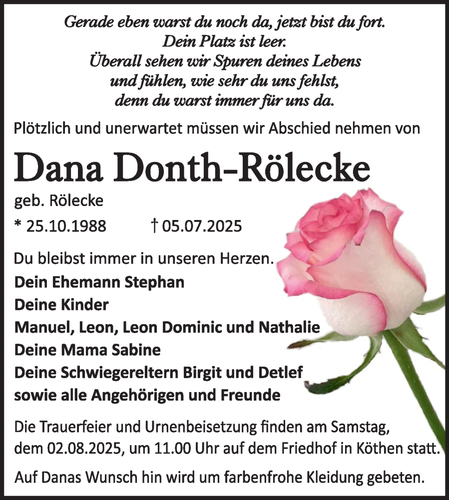 Hier finden Sie alle Traueranzeigen aus der Zeitung, die bisher für Dana Donth-Rölecke erschienen sind. Weitere Traueranzeigen, die in der Zeitung erscheinen, werden hier ebenfalls aufgelistet