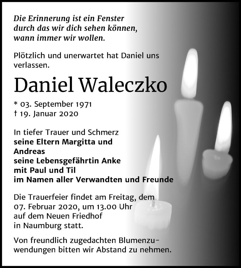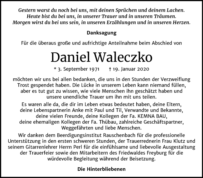Hier finden Sie alle Traueranzeigen aus der Zeitung, die bisher für Daniel Waleczko erschienen sind. Weitere Traueranzeigen, die in der Zeitung erscheinen, werden hier ebenfalls aufgelistet