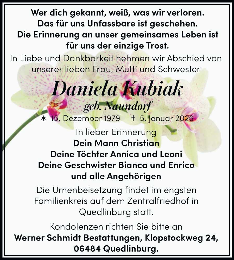 Hier finden Sie alle Traueranzeigen aus der Zeitung, die bisher für Daniela Kubiak erschienen sind. Weitere Traueranzeigen, die in der Zeitung erscheinen, werden hier ebenfalls aufgelistet