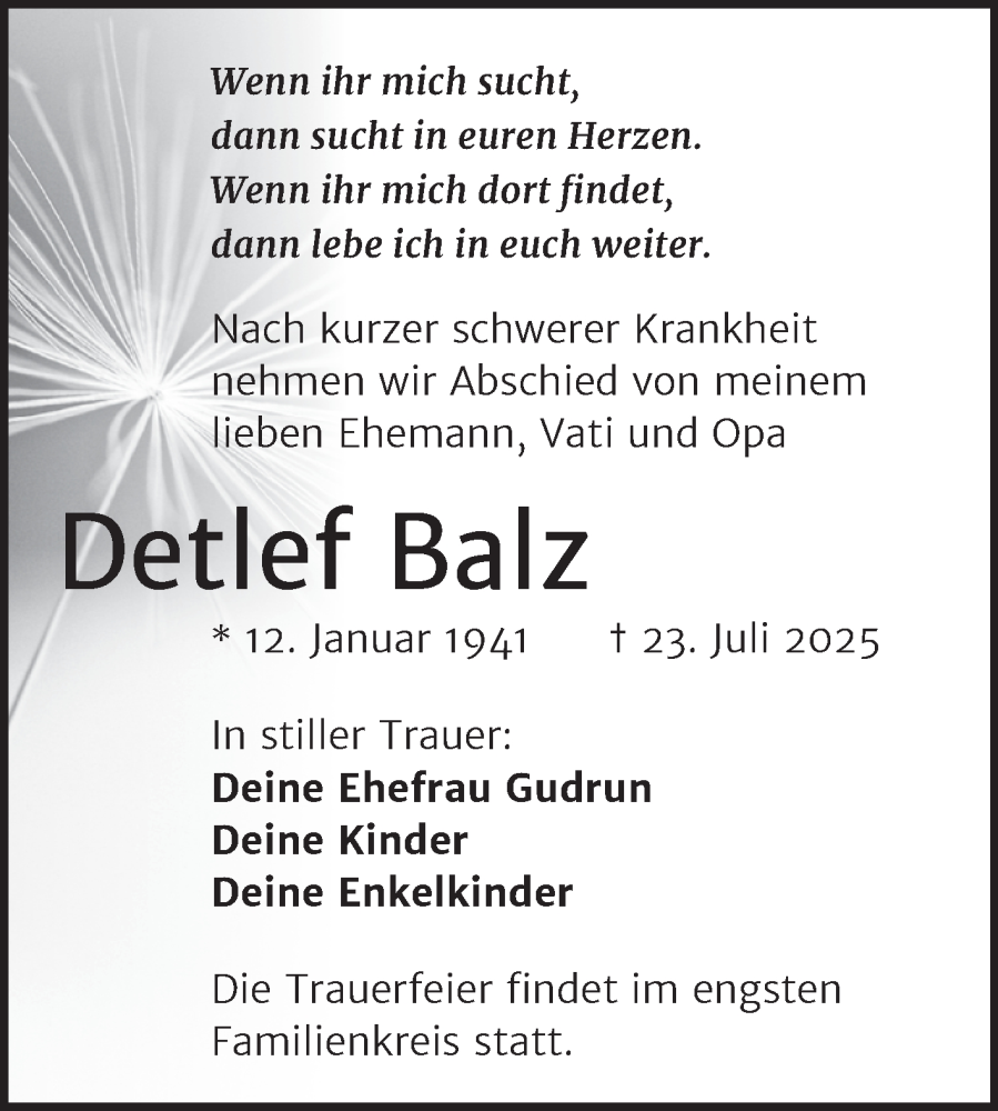 Hier finden Sie alle Traueranzeigen aus der Zeitung, die bisher für Detlef Balz erschienen sind. Weitere Traueranzeigen, die in der Zeitung erscheinen, werden hier ebenfalls aufgelistet