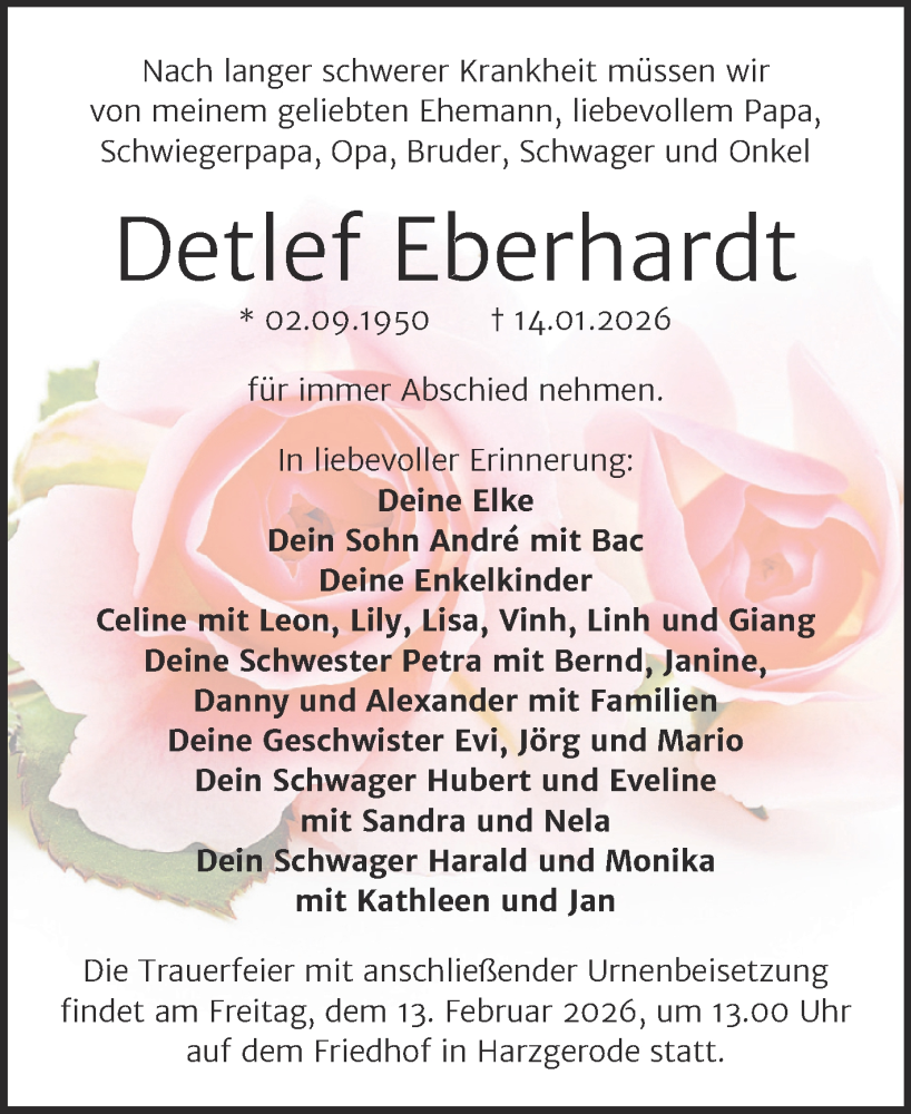 Hier finden Sie alle Traueranzeigen aus der Zeitung, die bisher für Detlef Eberhardt erschienen sind. Weitere Traueranzeigen, die in der Zeitung erscheinen, werden hier ebenfalls aufgelistet