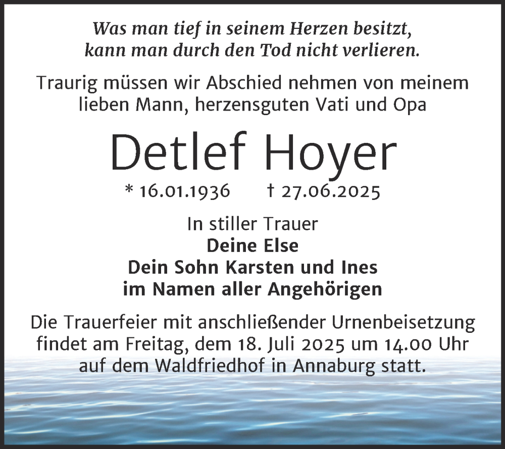 Hier finden Sie alle Traueranzeigen aus der Zeitung, die bisher für Detlef Hoyer erschienen sind. Weitere Traueranzeigen, die in der Zeitung erscheinen, werden hier ebenfalls aufgelistet