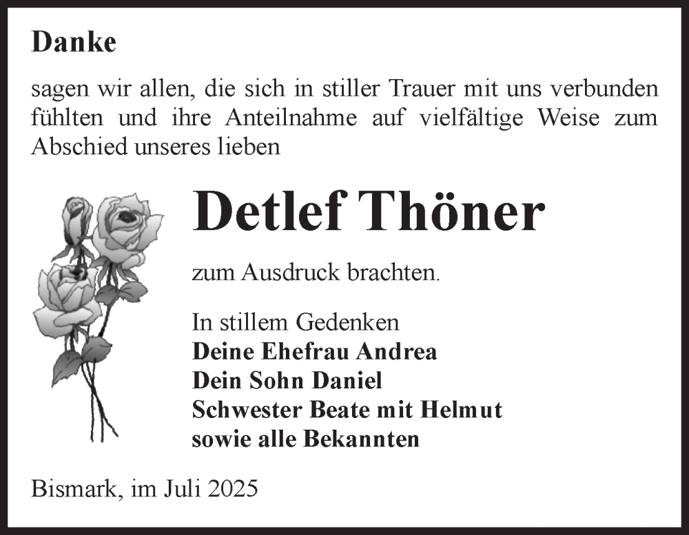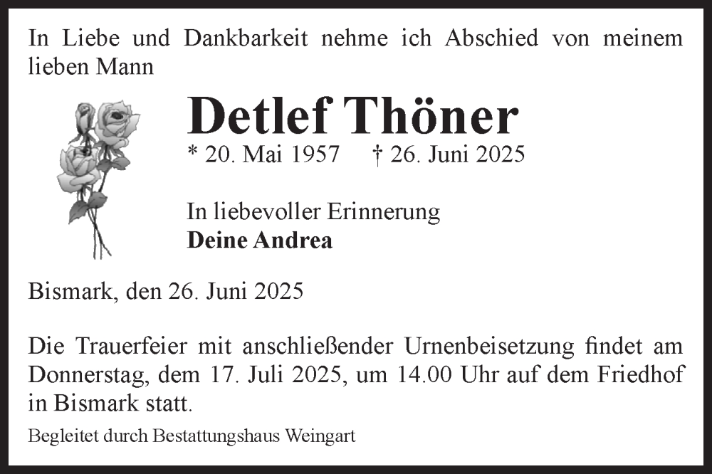 Hier finden Sie alle Traueranzeigen aus der Zeitung, die bisher für Detlef Thöner erschienen sind. Weitere Traueranzeigen, die in der Zeitung erscheinen, werden hier ebenfalls aufgelistet
