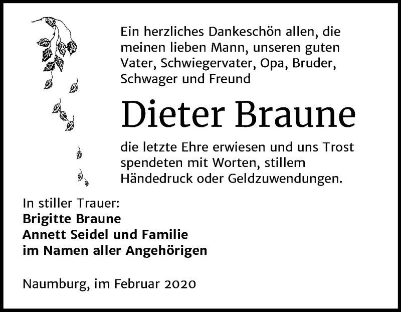 Hier finden Sie alle Traueranzeigen aus der Zeitung, die bisher für Dieter Braune erschienen sind. Weitere Traueranzeigen, die in der Zeitung erscheinen, werden hier ebenfalls aufgelistet