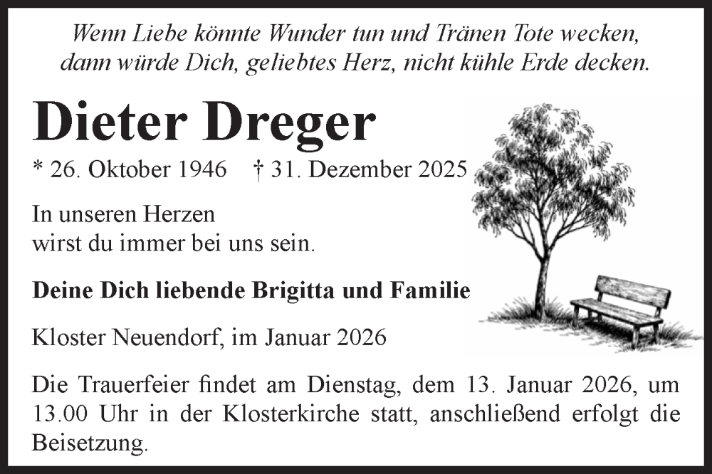Hier finden Sie alle Traueranzeigen aus der Zeitung, die bisher für Dieter Dreger erschienen sind. Weitere Traueranzeigen, die in der Zeitung erscheinen, werden hier ebenfalls aufgelistet