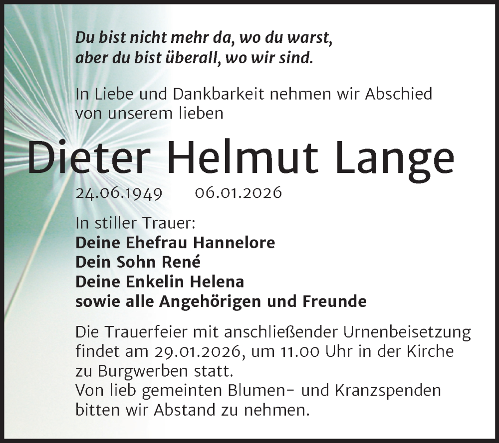 Hier finden Sie alle Traueranzeigen aus der Zeitung, die bisher für Dieter Helmut Lange erschienen sind. Weitere Traueranzeigen, die in der Zeitung erscheinen, werden hier ebenfalls aufgelistet