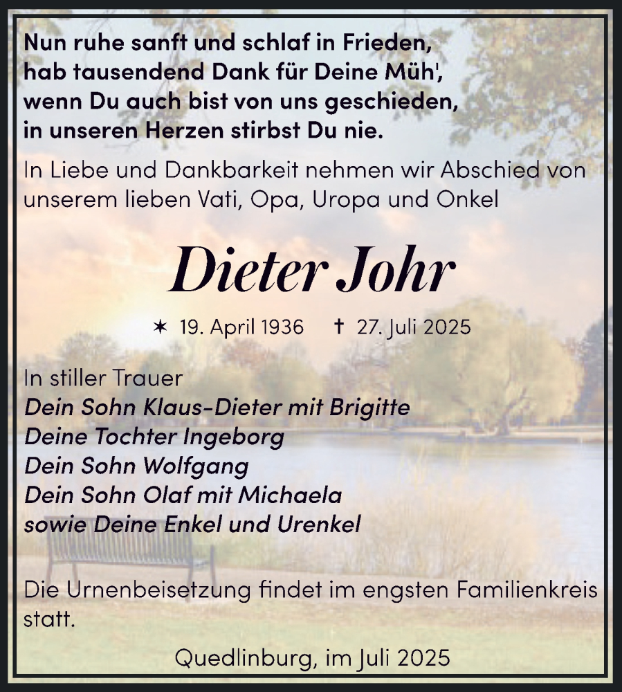 Hier finden Sie alle Traueranzeigen aus der Zeitung, die bisher für Dieter Johr erschienen sind. Weitere Traueranzeigen, die in der Zeitung erscheinen, werden hier ebenfalls aufgelistet