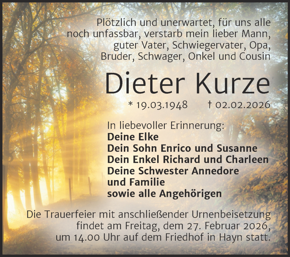 Hier finden Sie alle Traueranzeigen aus der Zeitung, die bisher für Dieter Kurze erschienen sind. Weitere Traueranzeigen, die in der Zeitung erscheinen, werden hier ebenfalls aufgelistet
