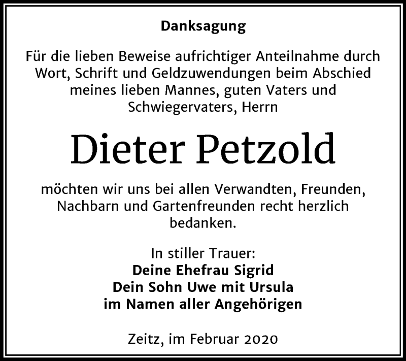 Hier finden Sie alle Traueranzeigen aus der Zeitung, die bisher für Dieter Petzold erschienen sind. Weitere Traueranzeigen, die in der Zeitung erscheinen, werden hier ebenfalls aufgelistet