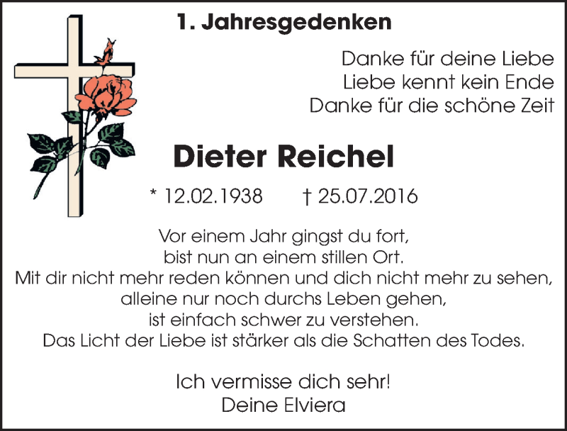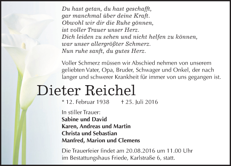 Hier finden Sie alle Traueranzeigen aus der Zeitung, die bisher für Dieter Reichel erschienen sind. Weitere Traueranzeigen, die in der Zeitung erscheinen, werden hier ebenfalls aufgelistet