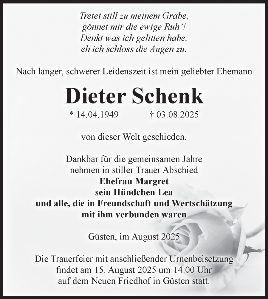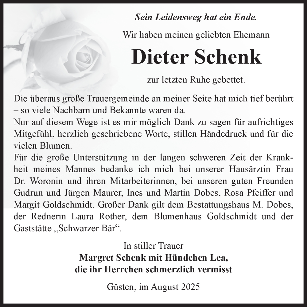 Hier finden Sie alle Traueranzeigen aus der Zeitung, die bisher für Dieter Schenk erschienen sind. Weitere Traueranzeigen, die in der Zeitung erscheinen, werden hier ebenfalls aufgelistet
