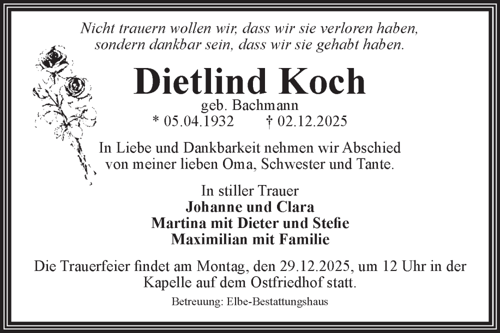 Hier finden Sie alle Traueranzeigen aus der Zeitung, die bisher für Dietlind Koch erschienen sind. Weitere Traueranzeigen, die in der Zeitung erscheinen, werden hier ebenfalls aufgelistet