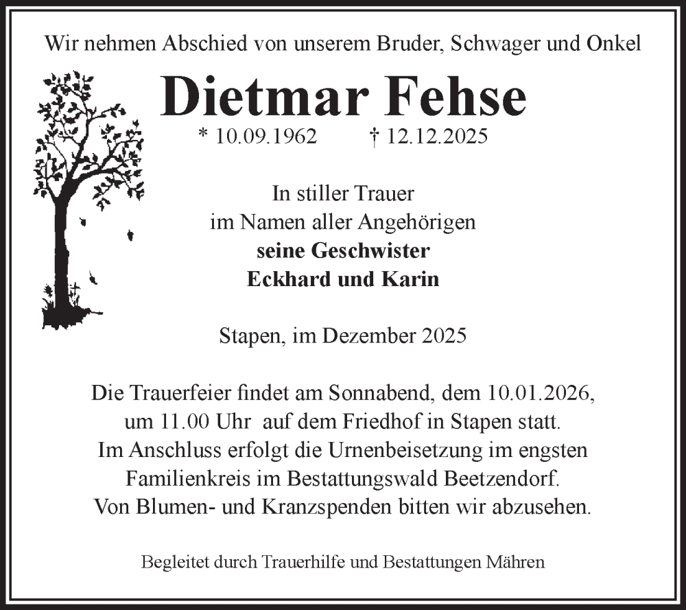 Hier finden Sie alle Traueranzeigen aus der Zeitung, die bisher für Dietmar Fehse erschienen sind. Weitere Traueranzeigen, die in der Zeitung erscheinen, werden hier ebenfalls aufgelistet