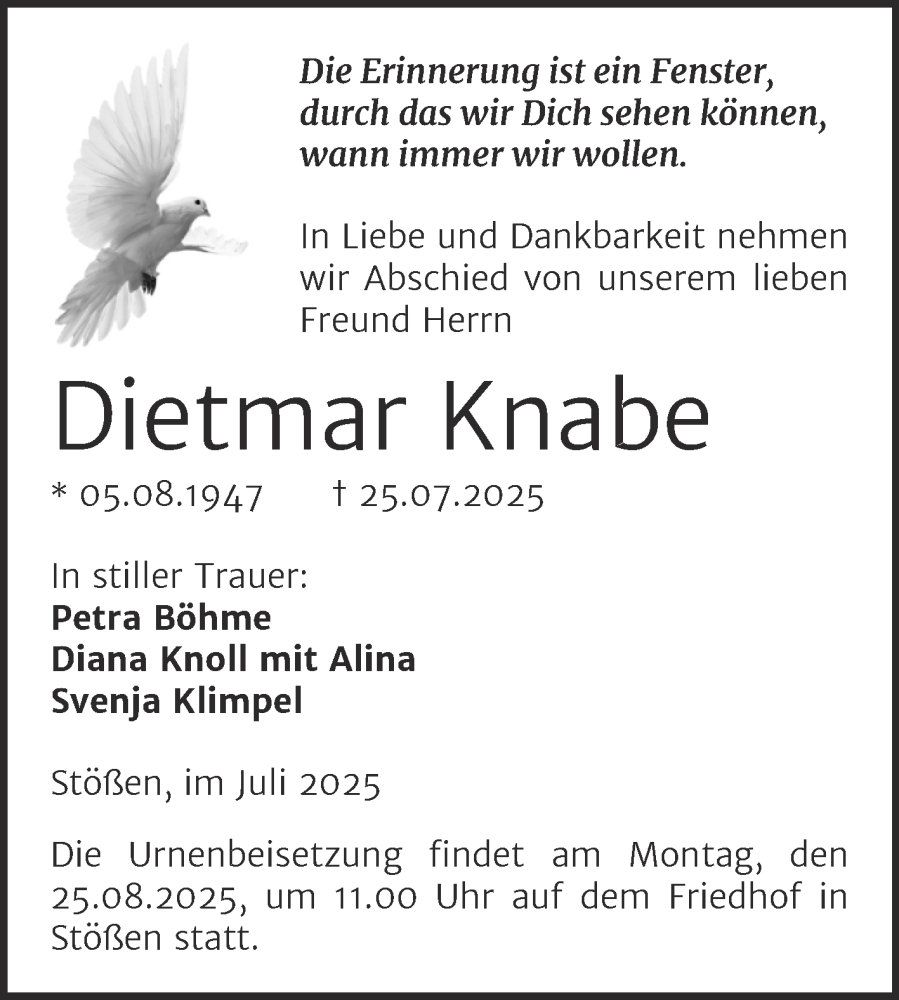 Hier finden Sie alle Traueranzeigen aus der Zeitung, die bisher für Dietmar Knabe erschienen sind. Weitere Traueranzeigen, die in der Zeitung erscheinen, werden hier ebenfalls aufgelistet