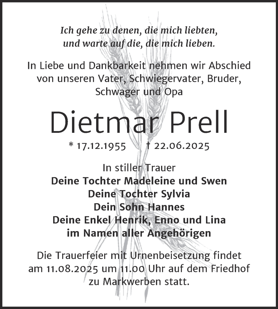 Hier finden Sie alle Traueranzeigen aus der Zeitung, die bisher für Dietmar Prell erschienen sind. Weitere Traueranzeigen, die in der Zeitung erscheinen, werden hier ebenfalls aufgelistet