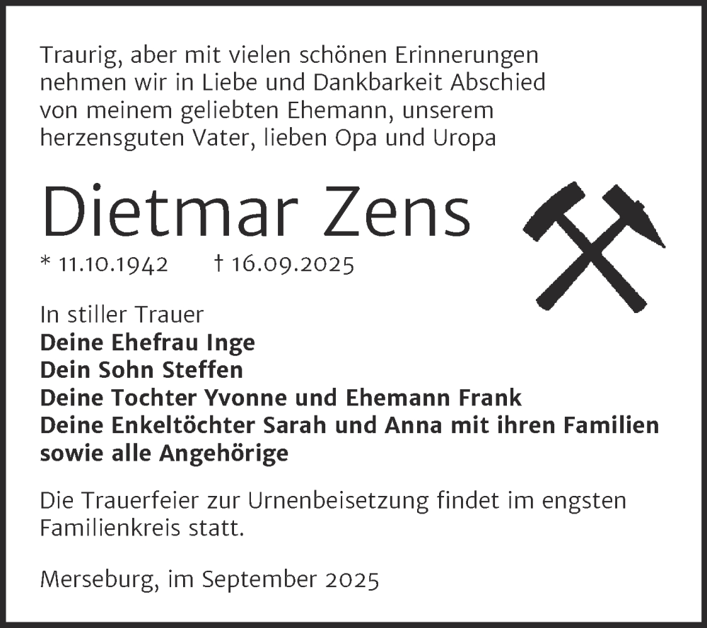 Hier finden Sie alle Traueranzeigen aus der Zeitung, die bisher für Dietmar Zens erschienen sind. Weitere Traueranzeigen, die in der Zeitung erscheinen, werden hier ebenfalls aufgelistet