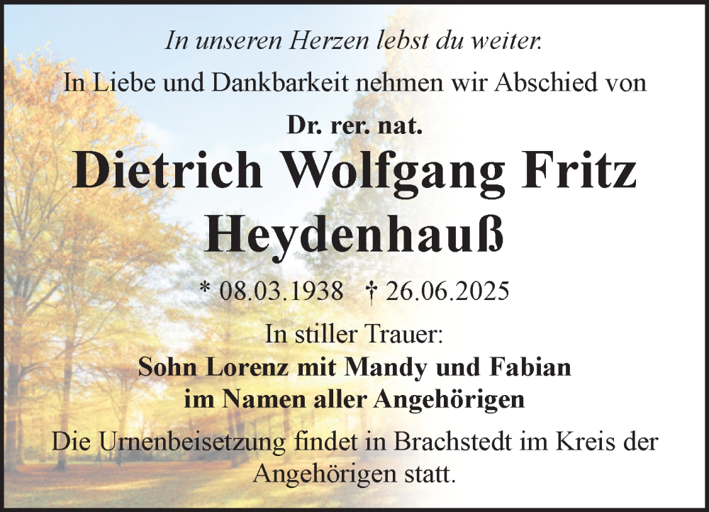 Hier finden Sie alle Traueranzeigen aus der Zeitung, die bisher für Dietrich Wolfgang Fritz Heydenhauß erschienen sind. Weitere Traueranzeigen, die in der Zeitung erscheinen, werden hier ebenfalls aufgelistet