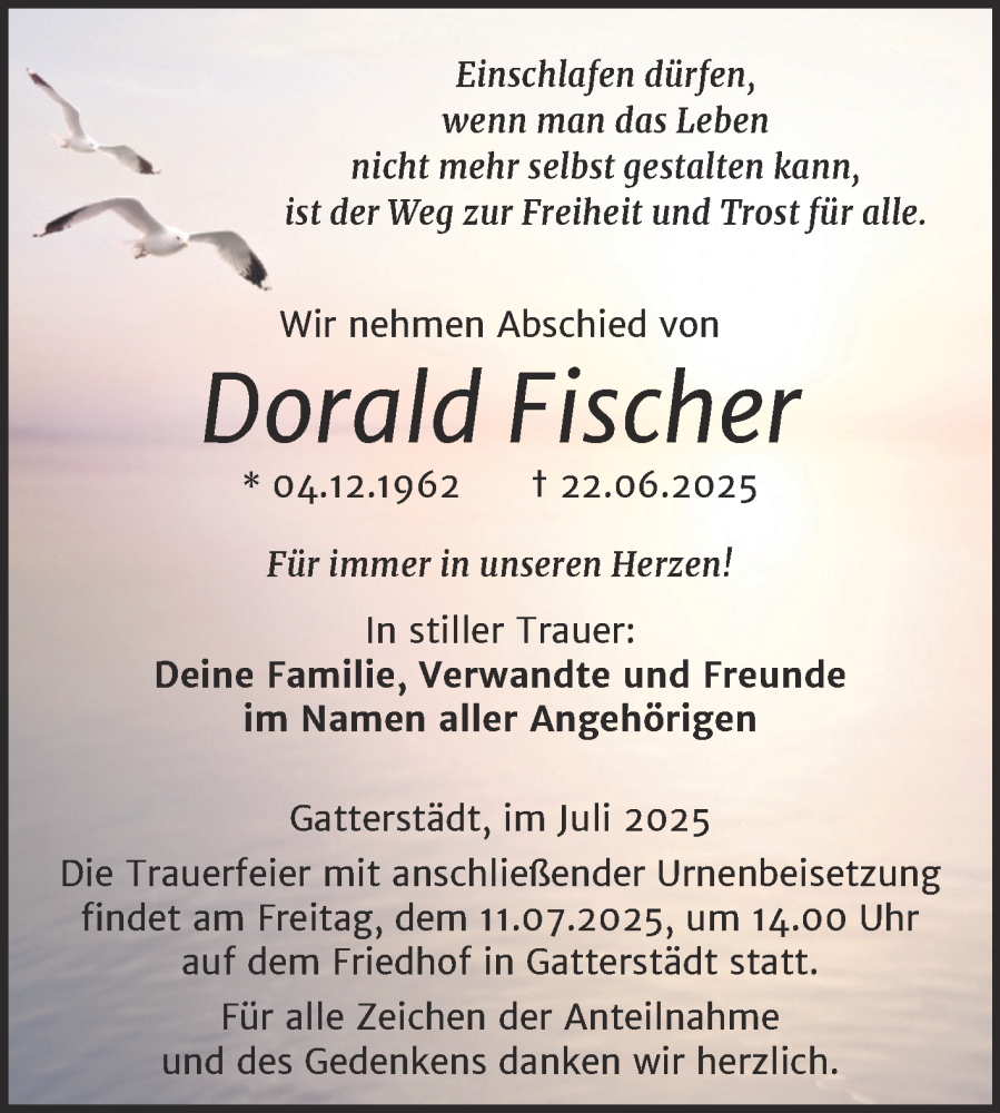 Hier finden Sie alle Traueranzeigen aus der Zeitung, die bisher für Dorald Fischer erschienen sind. Weitere Traueranzeigen, die in der Zeitung erscheinen, werden hier ebenfalls aufgelistet