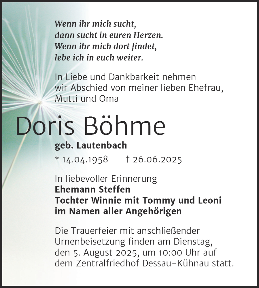 Hier finden Sie alle Traueranzeigen aus der Zeitung, die bisher für Doris Böhme erschienen sind. Weitere Traueranzeigen, die in der Zeitung erscheinen, werden hier ebenfalls aufgelistet