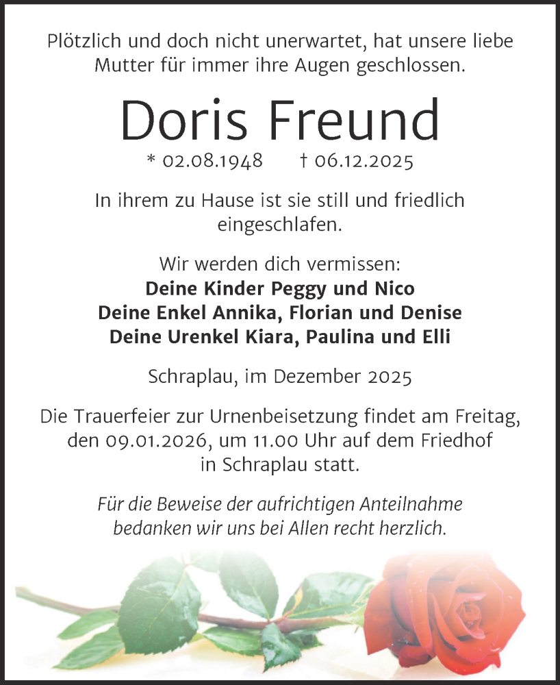 Hier finden Sie alle Traueranzeigen aus der Zeitung, die bisher für Doris Freund erschienen sind. Weitere Traueranzeigen, die in der Zeitung erscheinen, werden hier ebenfalls aufgelistet