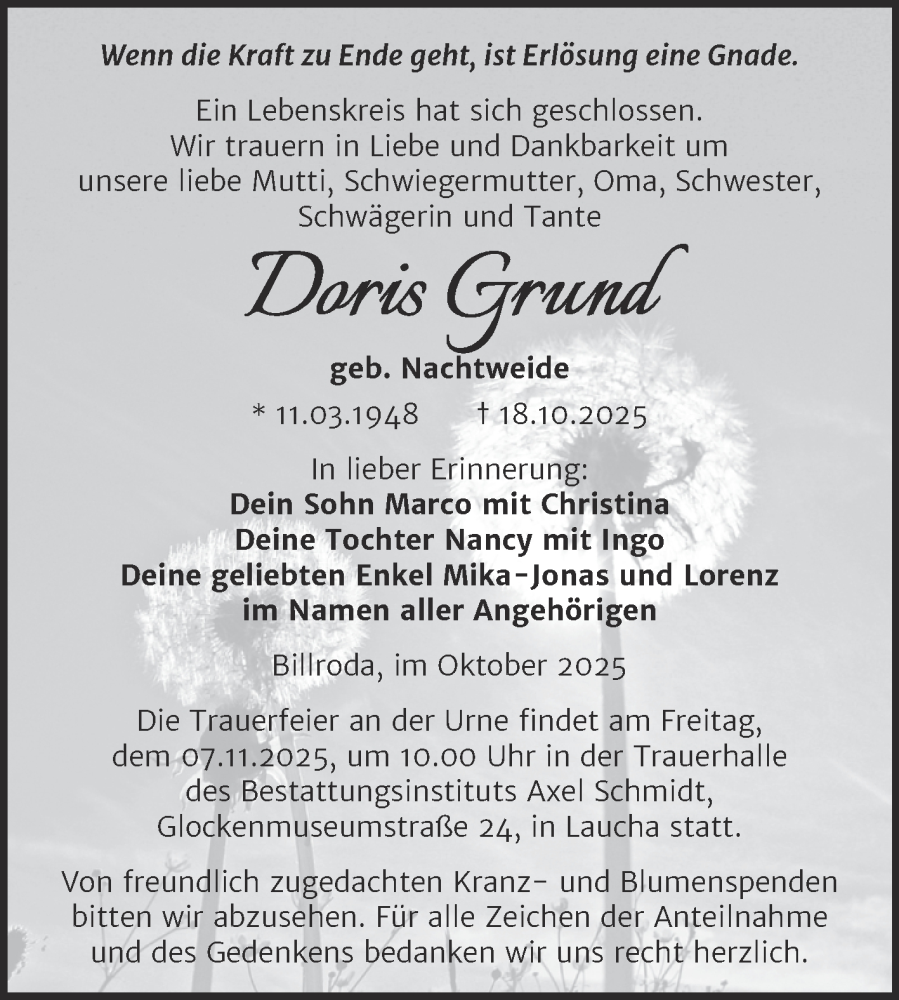 Hier finden Sie alle Traueranzeigen aus der Zeitung, die bisher für Doris Grund erschienen sind. Weitere Traueranzeigen, die in der Zeitung erscheinen, werden hier ebenfalls aufgelistet