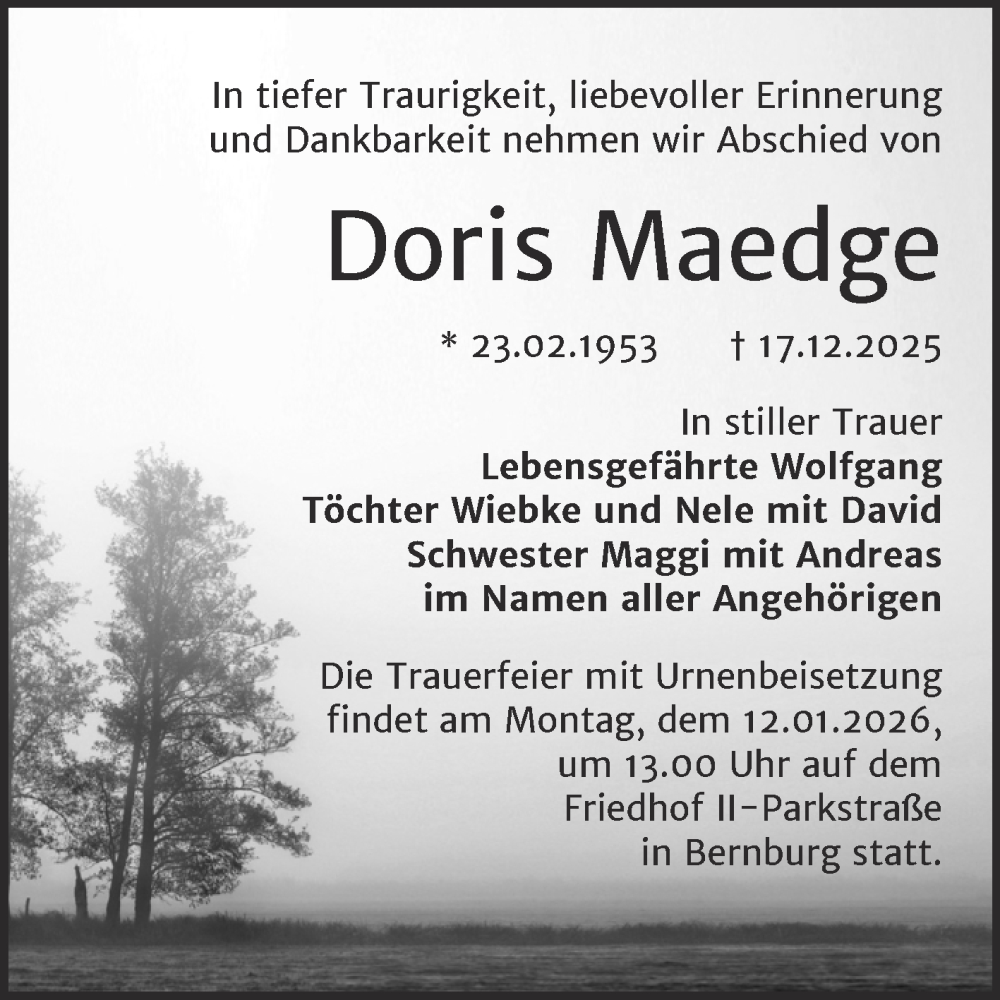 Hier finden Sie alle Traueranzeigen aus der Zeitung, die bisher für Doris Maedge erschienen sind. Weitere Traueranzeigen, die in der Zeitung erscheinen, werden hier ebenfalls aufgelistet