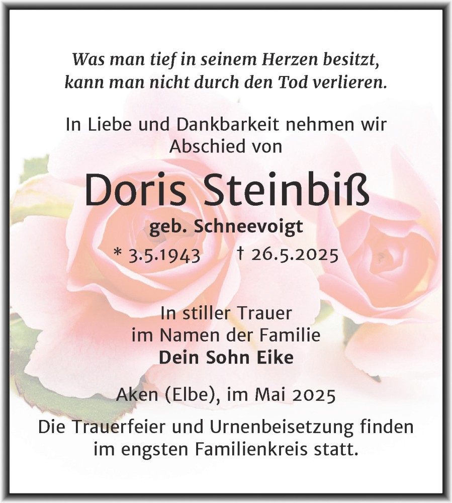 Hier finden Sie alle Traueranzeigen aus der Zeitung, die bisher für Doris Steinbiß erschienen sind. Weitere Traueranzeigen, die in der Zeitung erscheinen, werden hier ebenfalls aufgelistet